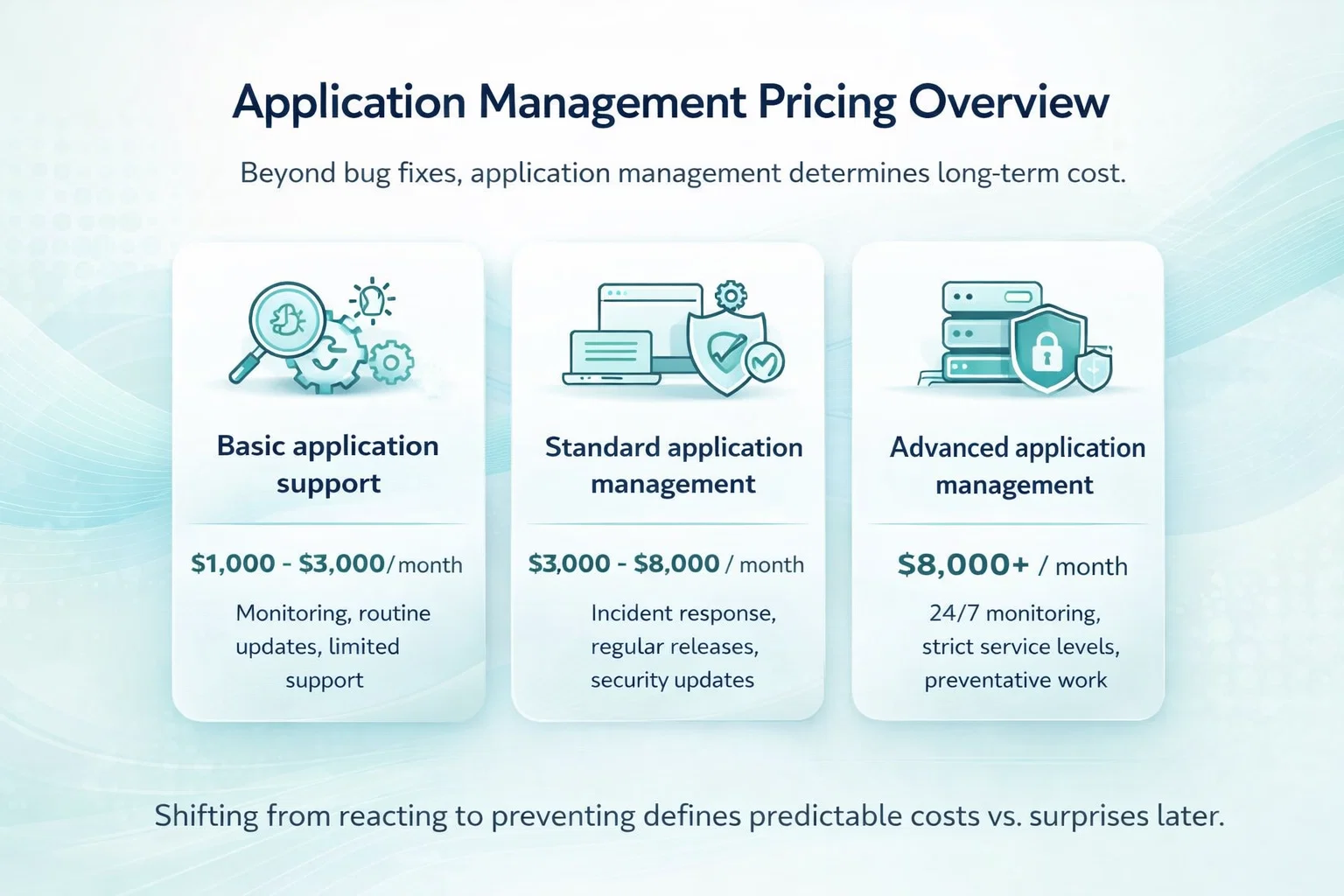 Application management is usually priced as an ongoing monthly cost. Once scope and risk are clear, pricing tends to fall into predictable ranges.