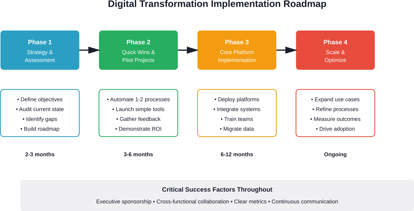 | Transformation Stage | Key Activities | Success Indicators | Common Challenges |