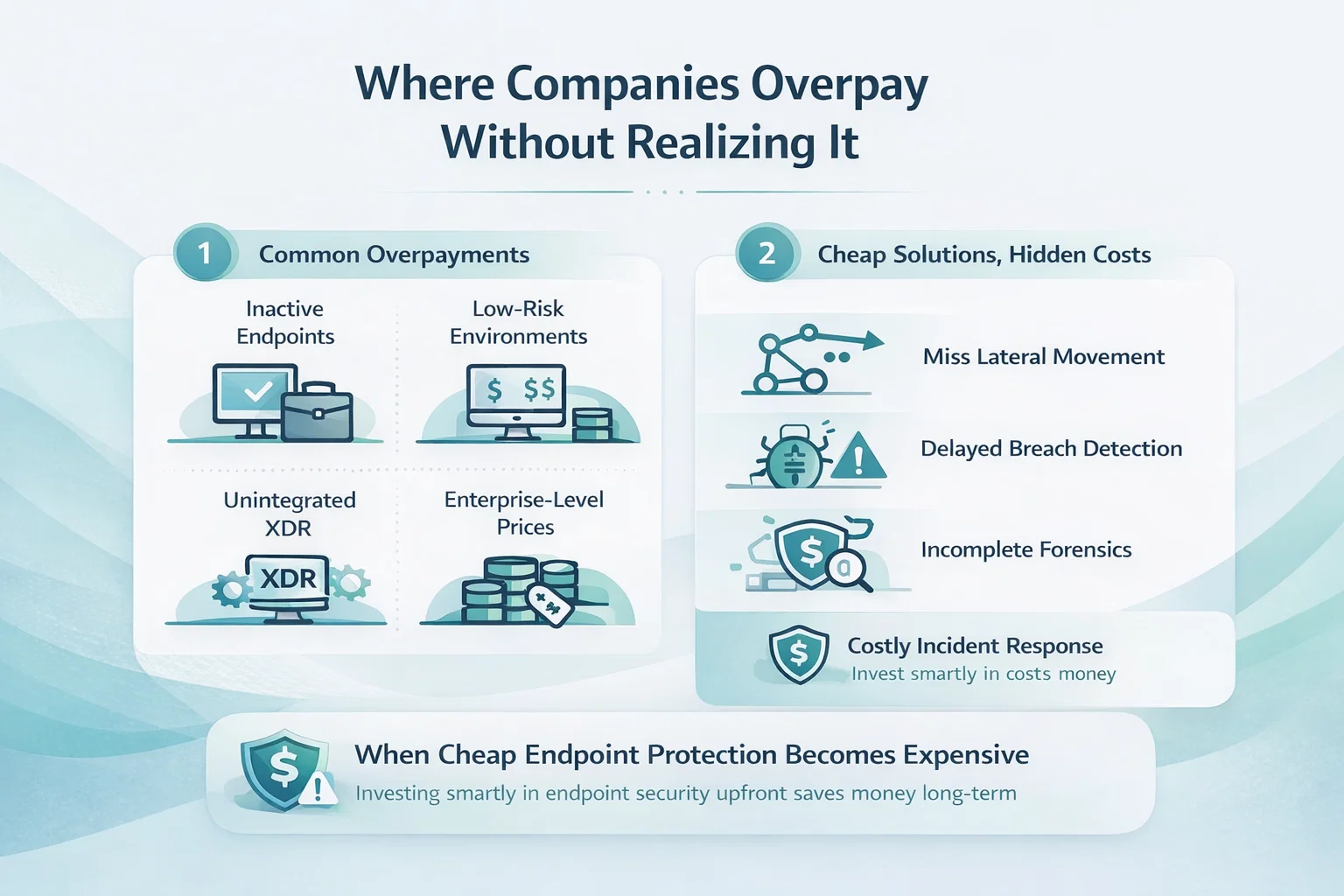 Overpaying for endpoint protection is common. Companies sometimes pay for EDR on devices that never leave the office, license inactive endpoints, overbuy XDR features that aren’t integrated, or pay enterprise-level prices for low-risk environments. Reviewing licenses quarterly can save thousands, yet it’s often overlooked.