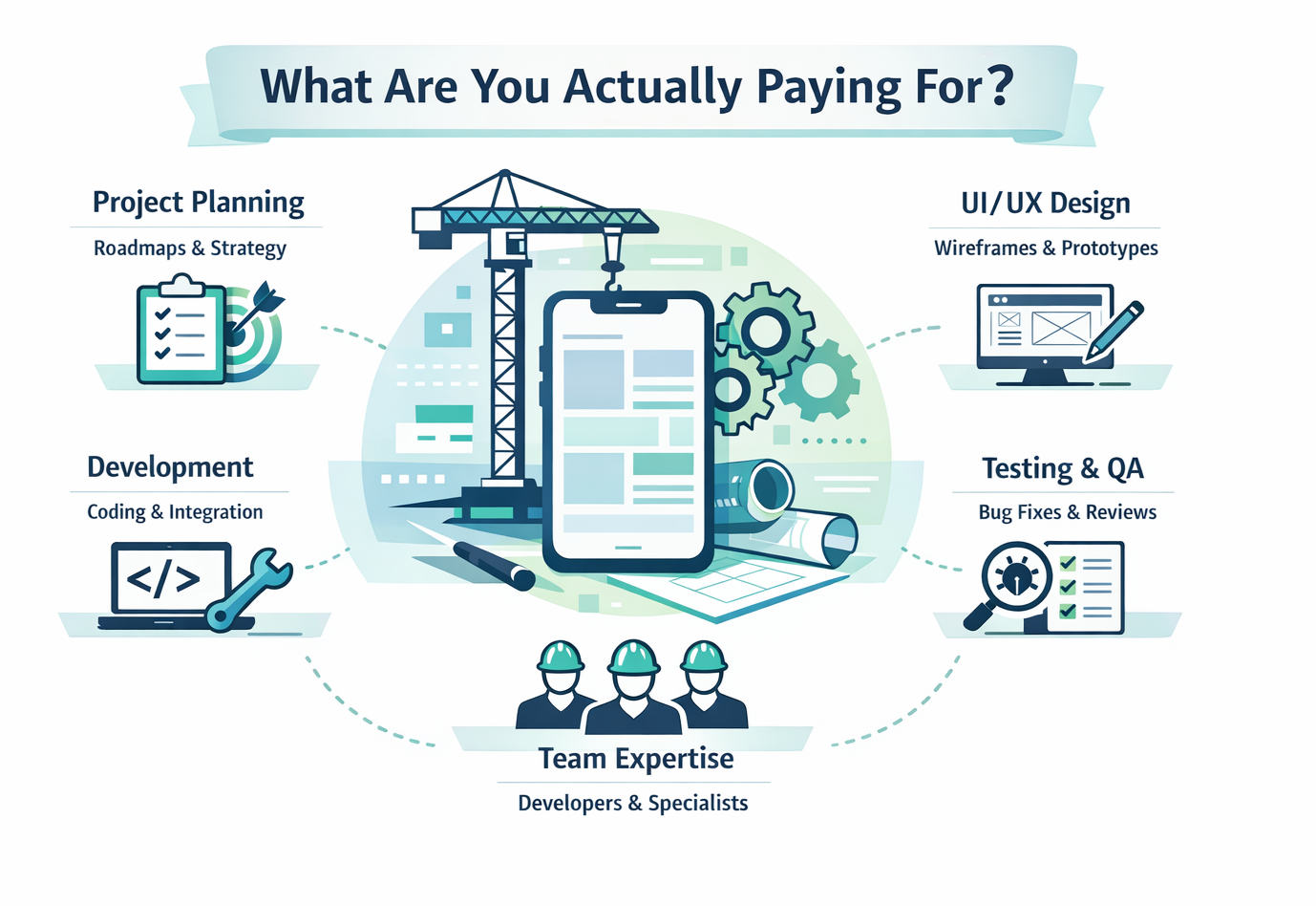 At the core, app development is less about the app itself and more about the team, time, and tools behind it. When you see a $50,000 estimate, it’s not just the final product – it’s the planning, design, coding, testing, and ongoing maintenance baked in. Let’s break it down into the major parts of the process: