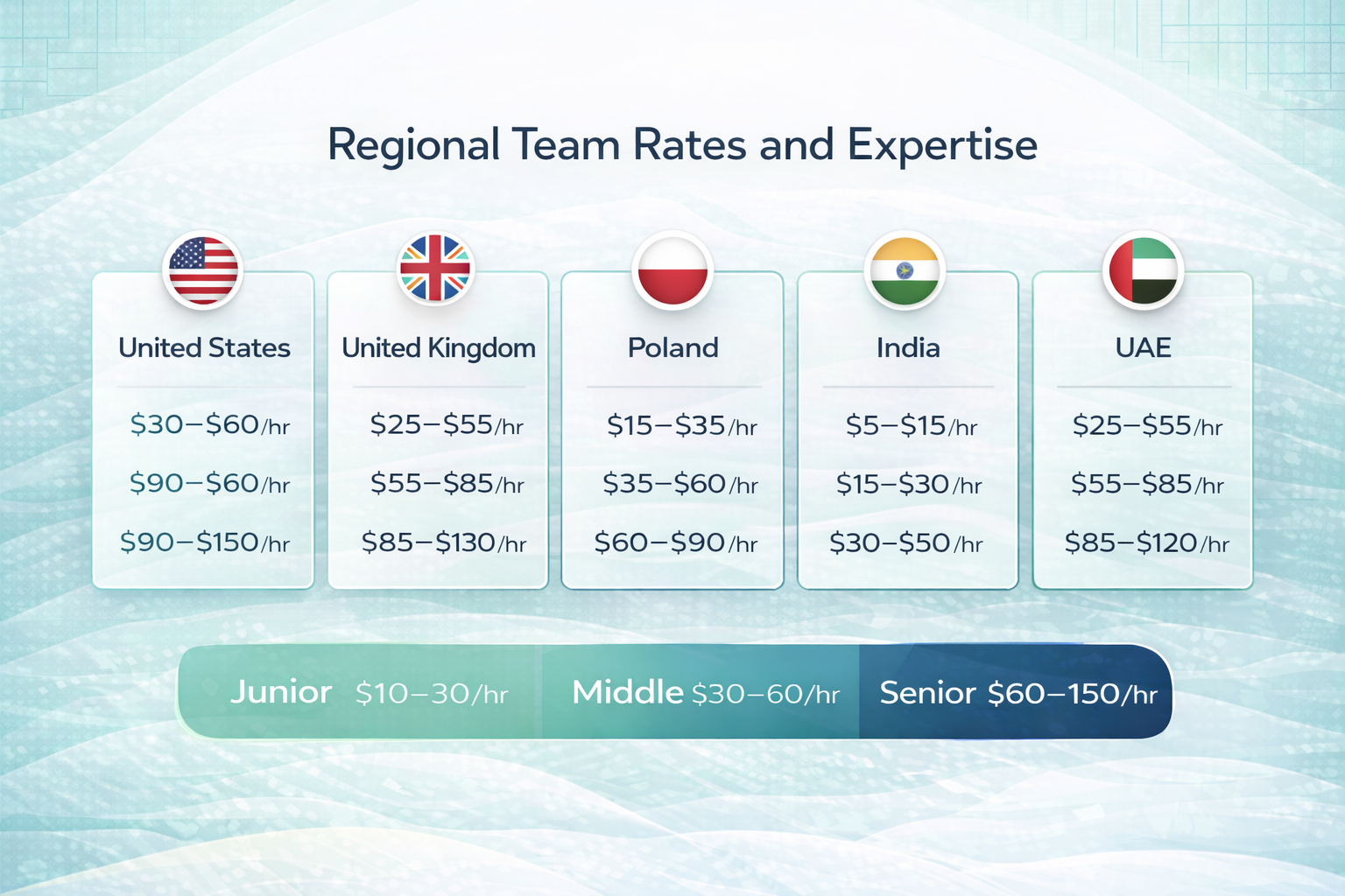 | Region | Junior Developer ($/hr) | Middle Developer ($/hr) | Senior Developer ($/hr) |