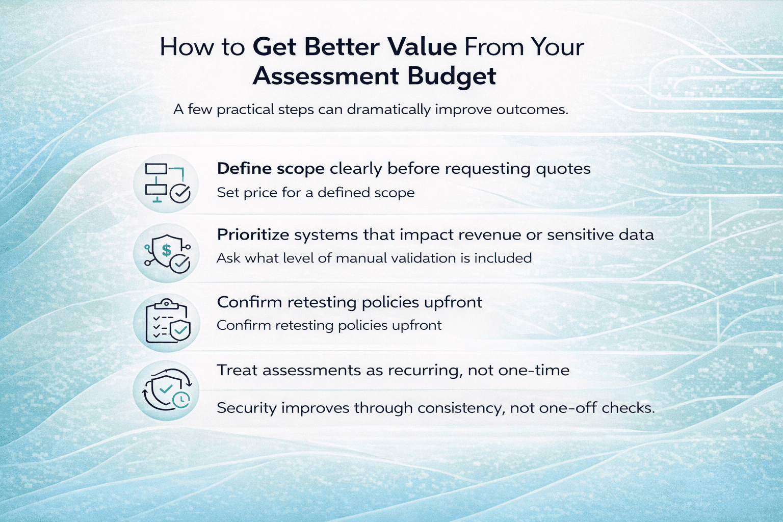 A modest assessment that prevents one serious incident can justify years of testing costs. Beyond breach prevention, assessments also support compliance efforts, improve audit readiness, reduce operational surprises, and strengthen security culture.