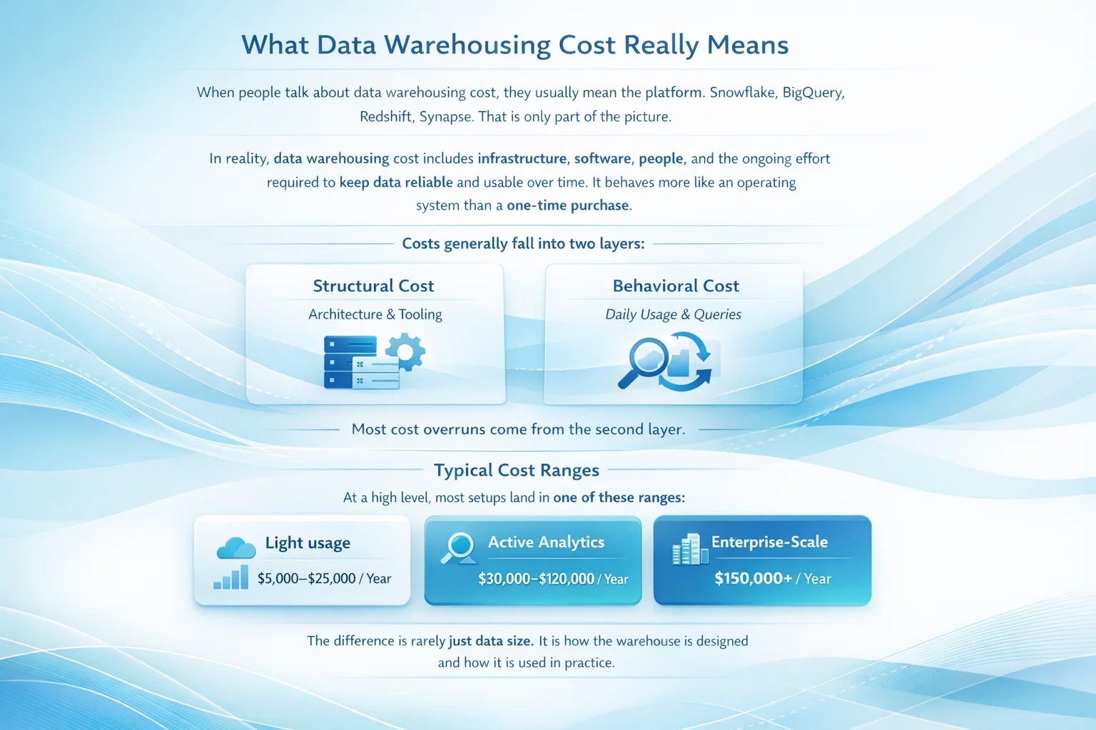 Data warehousing costs vary widely depending on scale and usage. Small teams may spend $5,000–$25,000 per year, growing businesses often fall in the $30,000–$120,000 range, and enterprise environments can exceed $150,000 per year. These figures include more than just the platform and reflect ongoing usage, engineering effort, and governance.