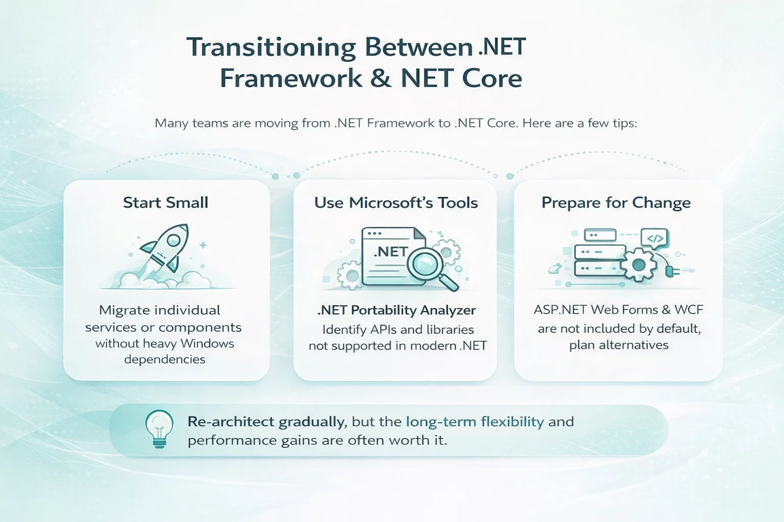 • Prepare for change: Technologies like ASP.NET Web Forms are not supported in .NET. WCF is not included by default, but you can use community-supported alternatives like CoreWCF for server-side compatibility.