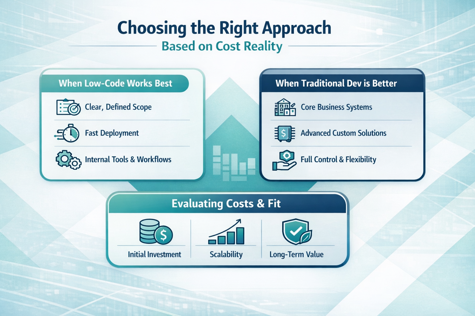 Deciding between low-code and traditional development is less about ideology and more about fit. Both approaches can be cost-effective in the right context, and both can become expensive when used in the wrong one. The key is understanding where each model tends to hold up financially over time.