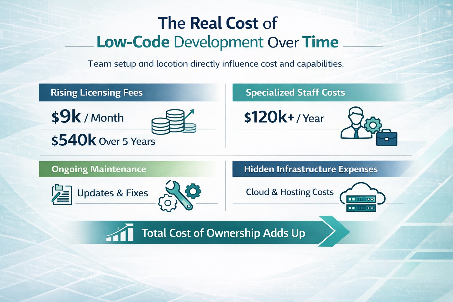 Low-code and rapid development approaches change where these costs show up, not whether they exist. You may spend less on initial coding, but expenses often reappear later through licensing, customization limits, or scaling constraints.